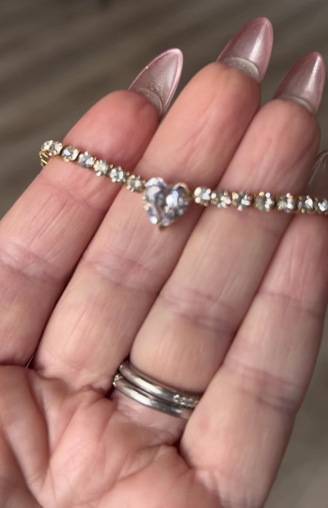 Who doesn't love a tennis necklace with a beautiful crystal heart stone in the middle to add to the brilliance? Dress up any daytime jeans and tee or make it the focal point for your nighttime outfit!