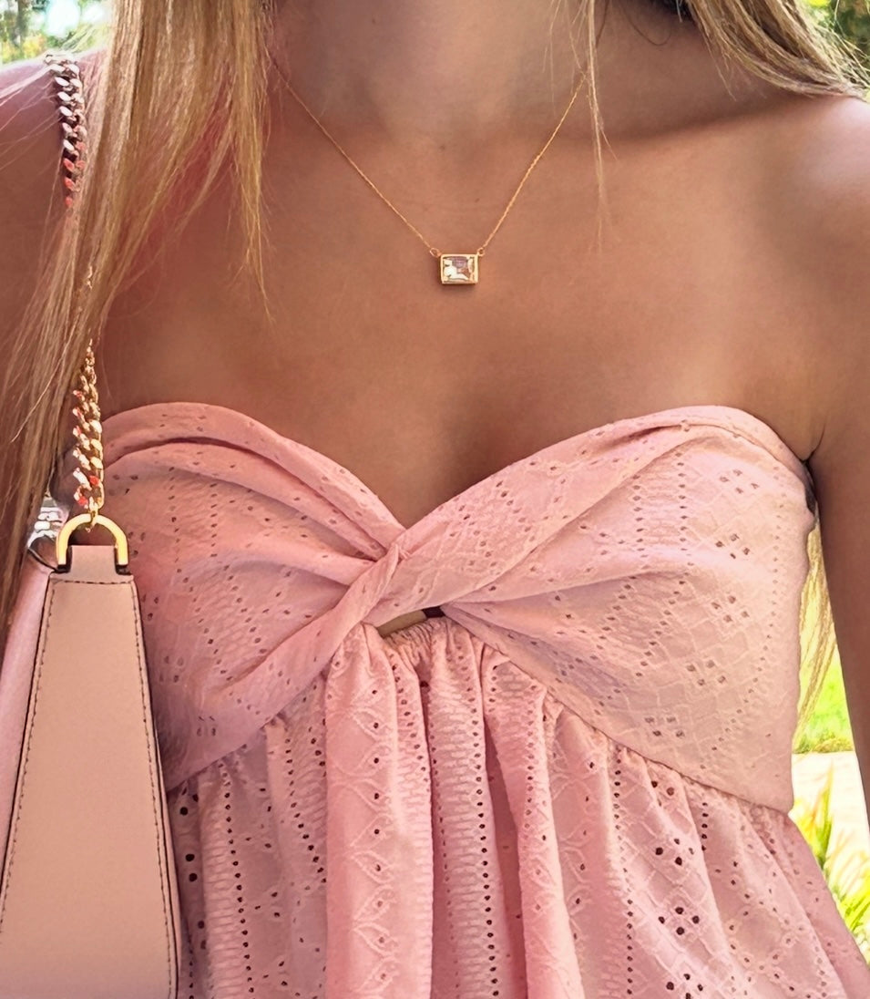 Elevate your look with this dainty chain and square glass pendant. 18K gold plated brass. lead and nickel free. 8" long