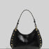 Looking for the perfect black shoulder bag? This is the hottest bag for Fall! The perfect size shoulder bag for running around town or a night out. Has a sleek look with the added gold studs and gold hardware.