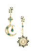 Can't decide what you love better...the sun or the moon? Wear both! A very eclectic mismatched pair of earrings with green and gold mix in these sun and moon earrings to create a truly stunning pair! Additionally, these gold earrings are adorned with numerous CZ crystals that add that much more brilliance to the gold/green coloration of the earrings!
